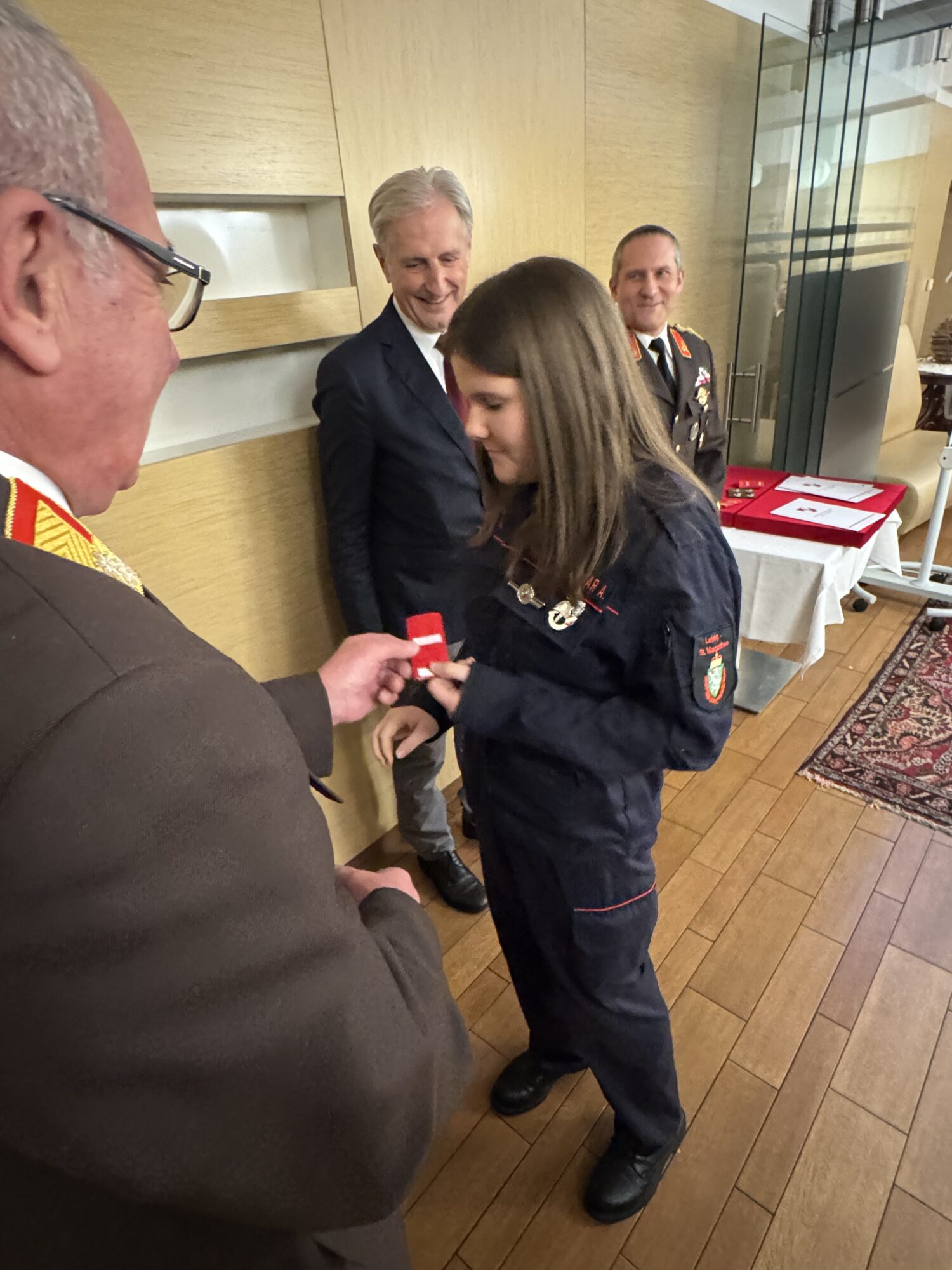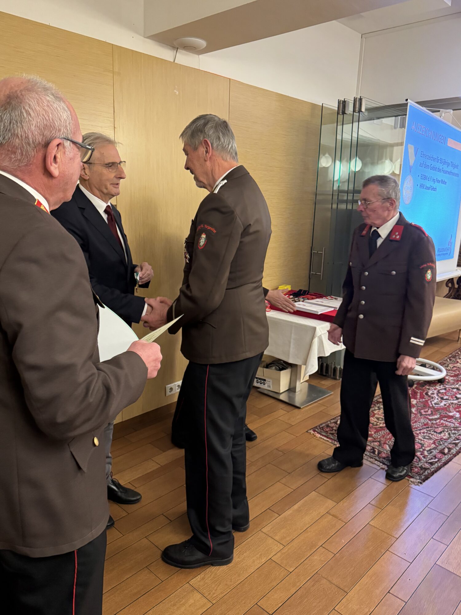 - Ehrenzeichen für 50jährige Tätigkeit > Oberbrandmeister des Fachdienstes Ing. Peter Walter, Hauptfeuerwehrmann Josef Gritsch