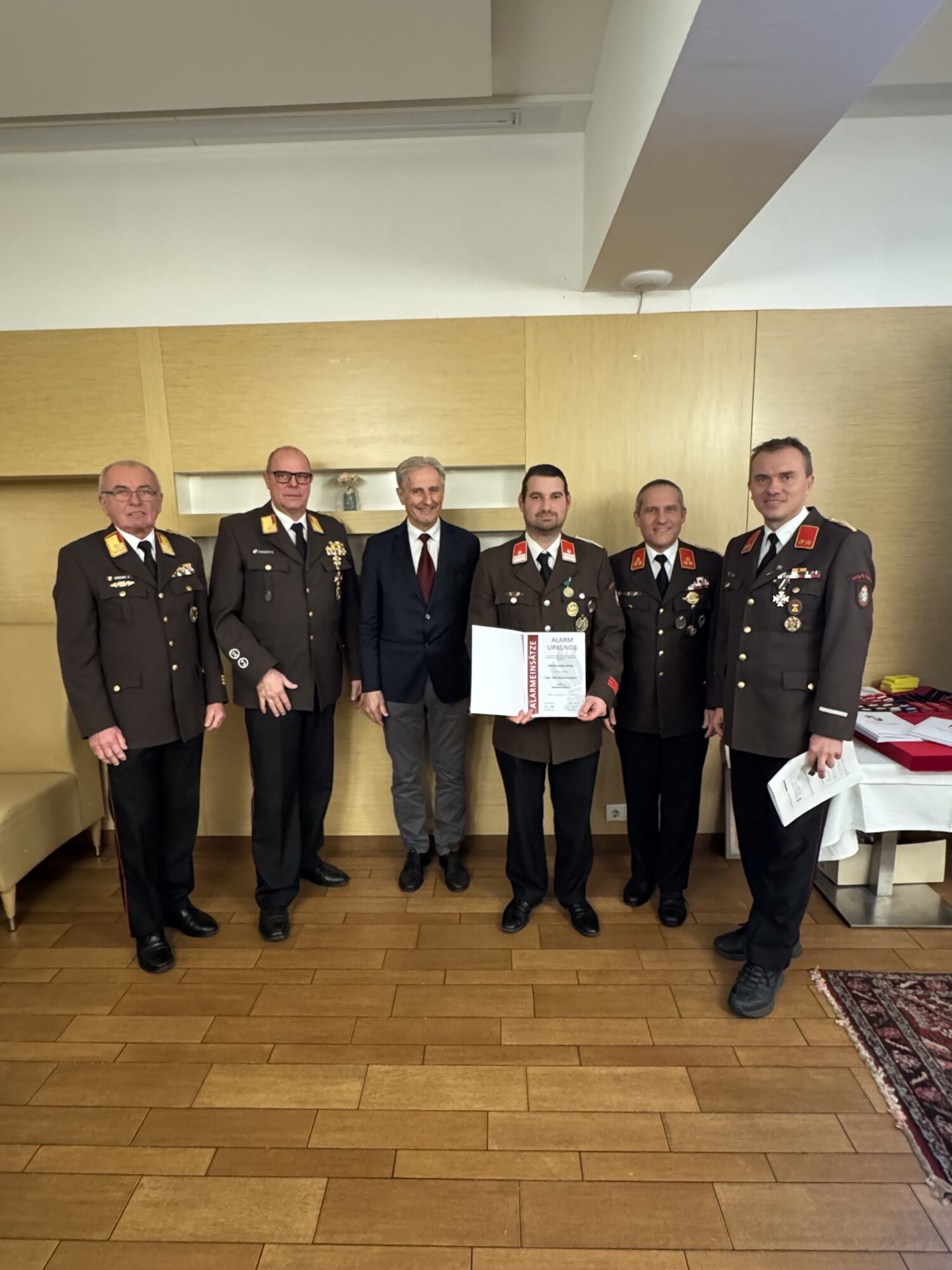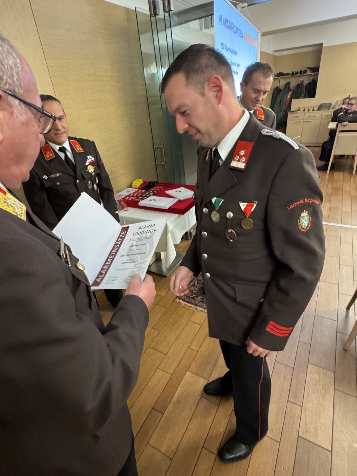 An Oberbrandinspektor Christian Pusnik wurde die Alarmurkunde für 550 Einsätze überreicht.